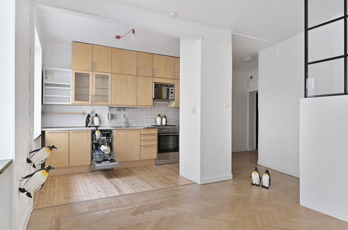 Öppen planlösning mellan kök och vardagsrum kräver en estetisk och diskret kökslösning. Det får du här. All utrustning finns längs söderväggen, förutom kyl/frys som döljs i en alkovpelare. Du får mycket god förvaring i hurtsar, skåp och lådor i slätt ljust trä med slanka handtag i rostfritt. Skåpen går ända upp i taket och har ett par vitrinluckor där du kan ha de snyggaste glasen eller keramiken. Den nya köksutrustningen i rostfritt smälter väl in. Hällspis med ugn, en nätt diskmaskin, mikro i arbetshöjd samt kyl/frys. Diskho med hög utkastare. Stänkskydd av grått kakel över spotbelyst arbetsyta. Bänkskiva i rostfritt och grått stenmaterial. Dessutom handduksräcke och krokar samt en öppen vit hylla vid fönstret. Vitt i tak, på väggar och snickerier samt organiskt ådrat trägolv.
