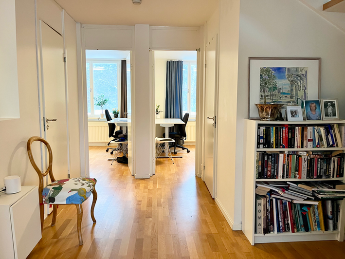 Välkomnande, ljus hall med stort glasparti och avhängningsmöjlighet. Innanför hallen finns ett rum som med fördel kan användas som kontor. Från detta rum når man baksidan av huset med dess härliga terrass med kvällssol och fri utsikt mot skogen.