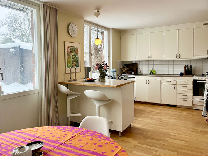 Vidare finns ett smakfullt väl tilltaget kök med öppen planlösning mot matplats och access ut till husets tomt på framsidan. Två sovrum, ett badrum samt tvättstuga.
